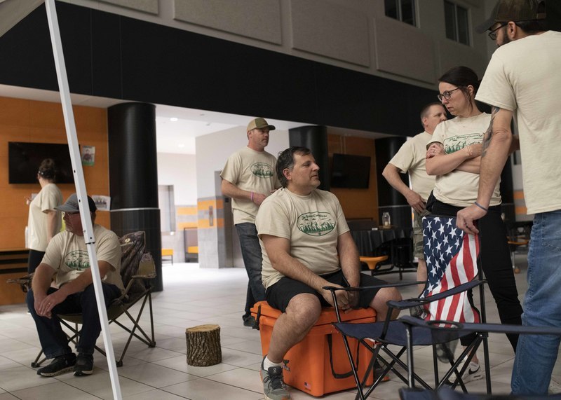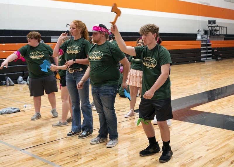 Harley Connor on the peg hitting game. On the other side, a team pounds the pegs the other way. The team that has the most in when time runs out wins.