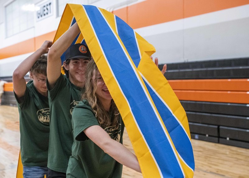 Sophomore class with Kale Kelley and Blake Lyons breaking through its banner.