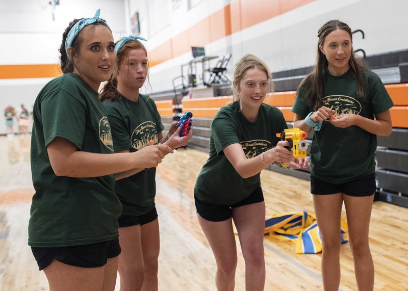 Harley Connor aims a dart gun while Laci Hollerich, Emma Sweere and Lexy Waldron wait their turn.