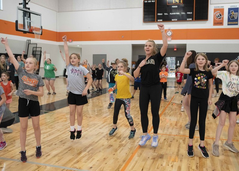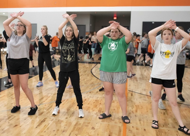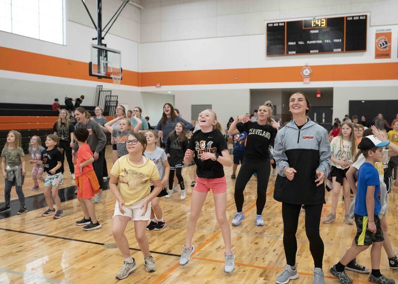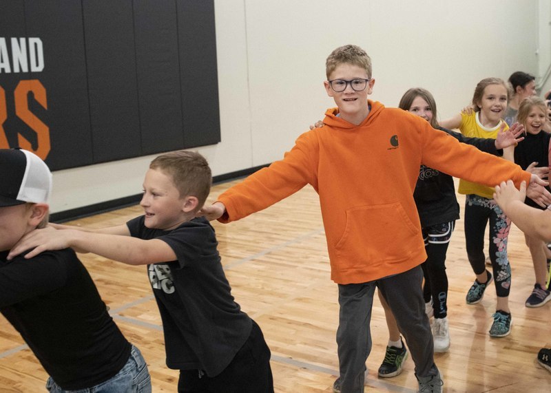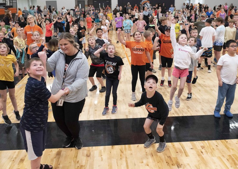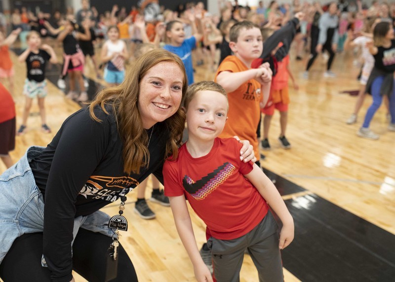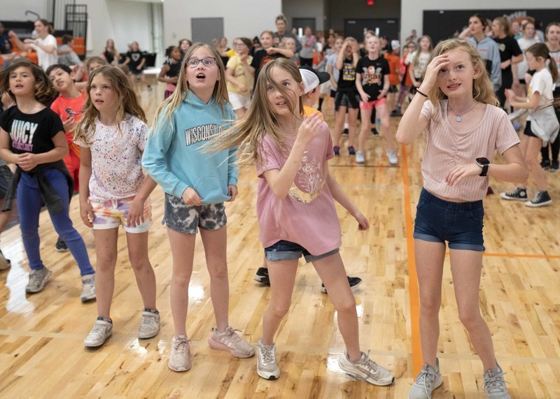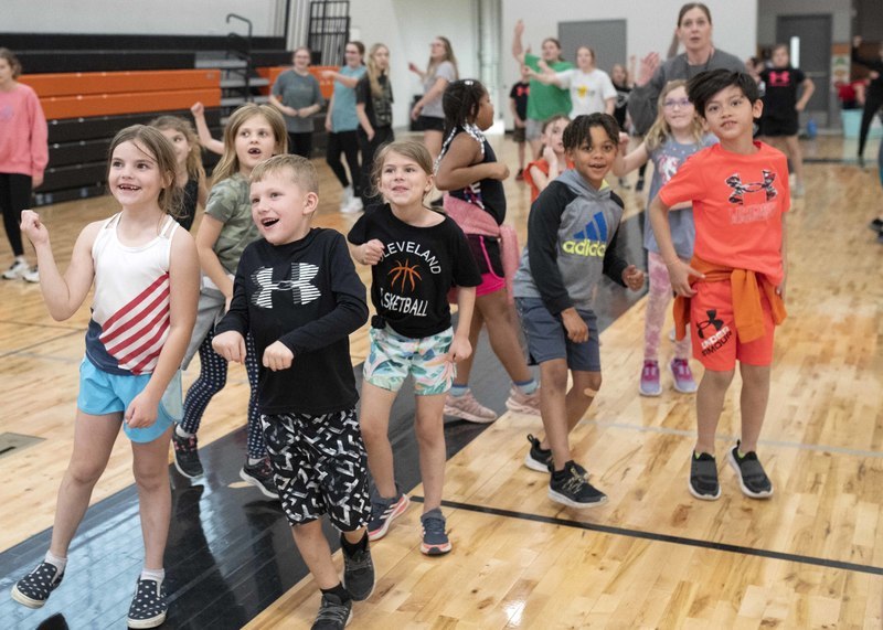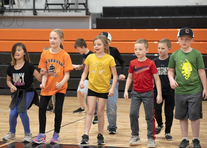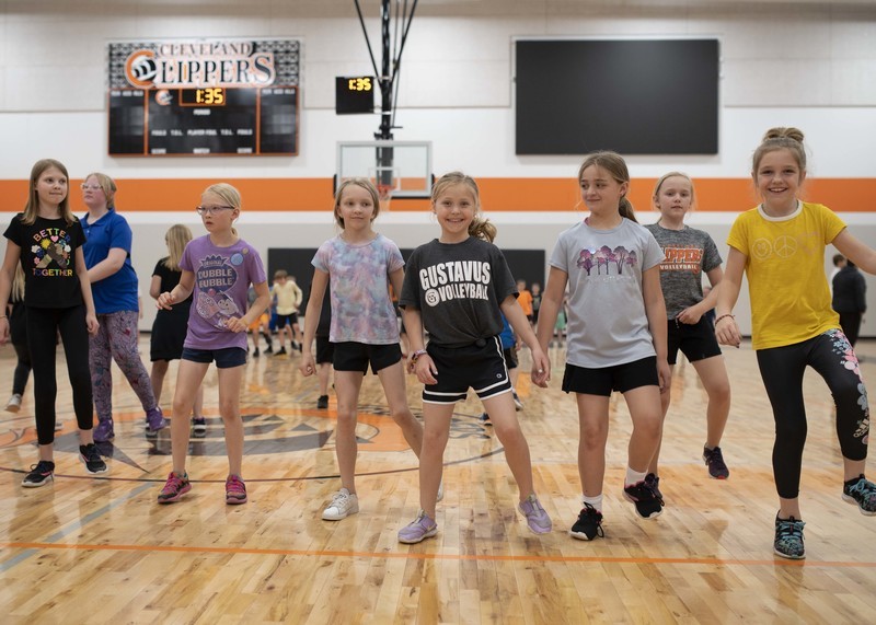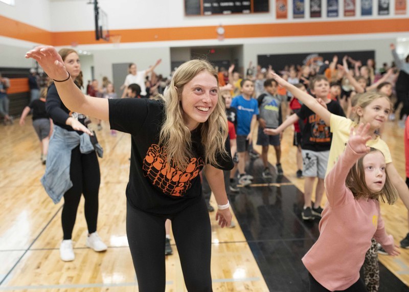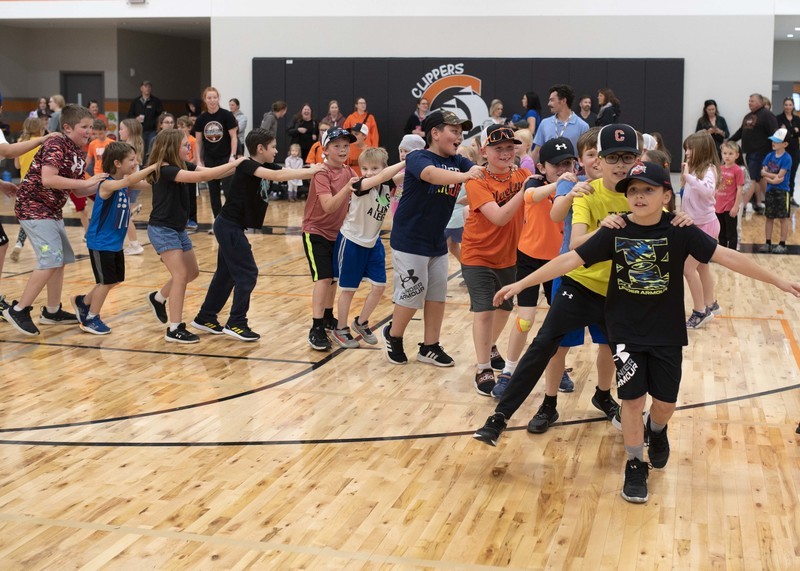So, instead of races and jumping and throwing events, a dance party broke out in the new gym, and the K-6 students wore off energy moving to steps shown on the jumbotron above.