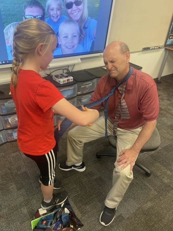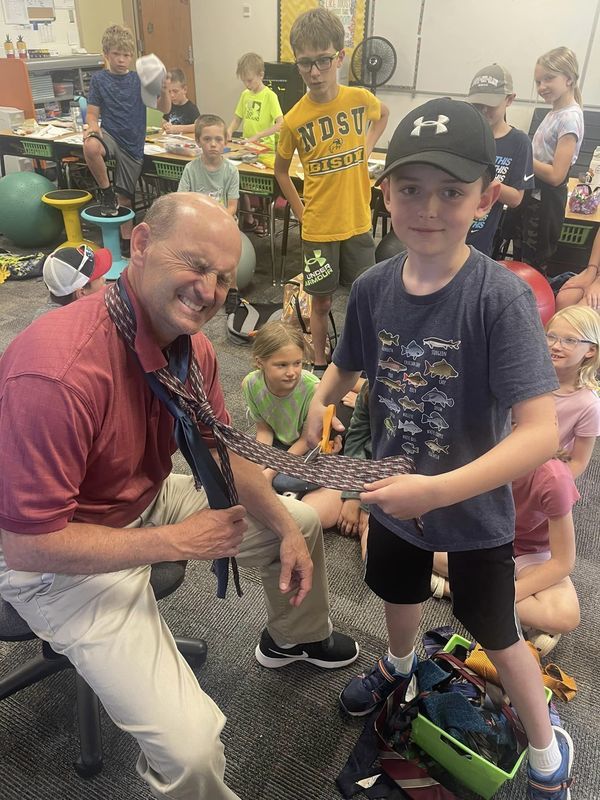 Breanna Bosse, Lucy Smith, and Will Koppelman from Mrs. Smith's 3rd-grade class each got to cut off Mr. Cink's tie for earning over 200 Accelerated Reader points!