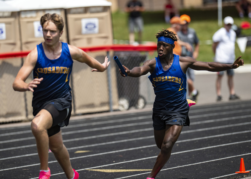 Henry Strobel hands off to Josh Kann in the 4x100. It was the last act of a fine athletic career for the senior.