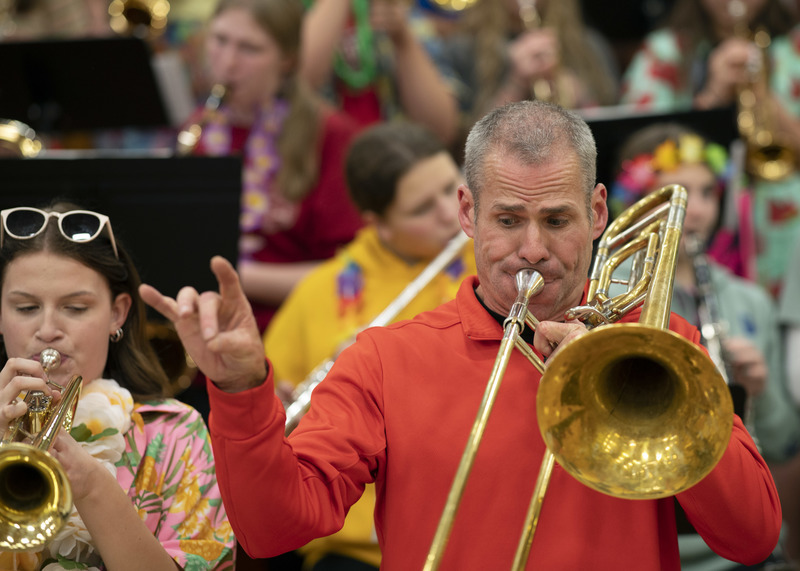 Director Erik Hermanson on the trombone during Pep Band.