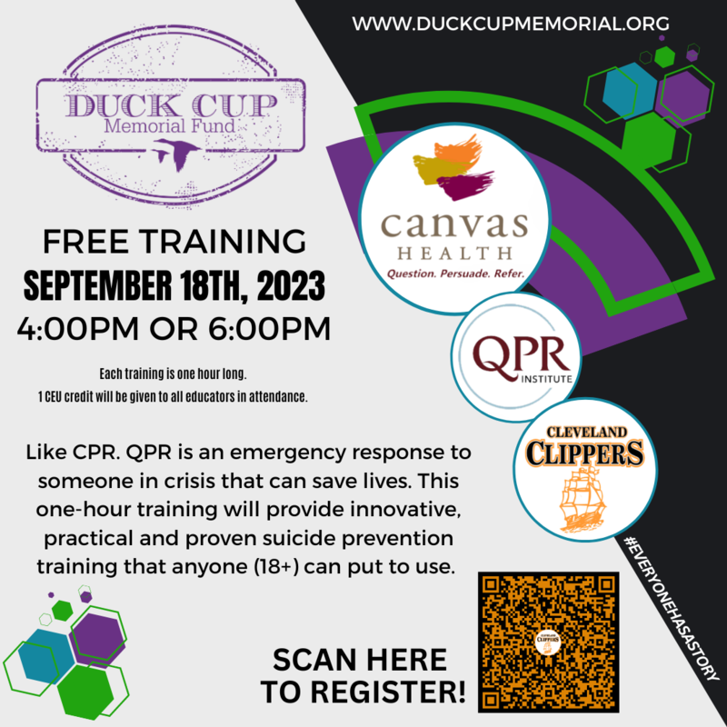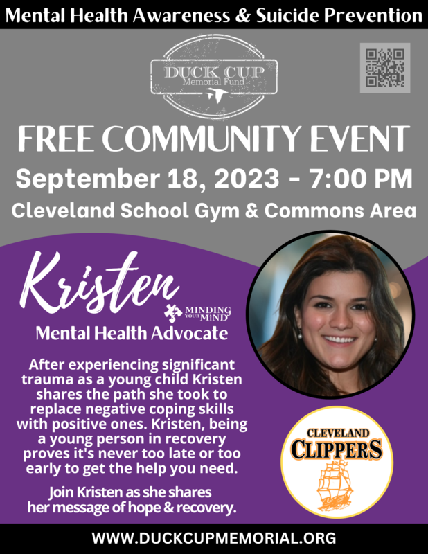 SAVE THE DATE!! Returning again this school year the Duck Cup foundation is continuing its mission to spread mental health awareness and suicide prevention. Students 5th-12th grade will see the presentation during the school day. parents and community members are highly encouraged to come for the QPR training and community event in the evening. See fliers for more details and reach out to Mrs. Roloff for any questions. roloff.shanna@isd391.org or 507-484-1350