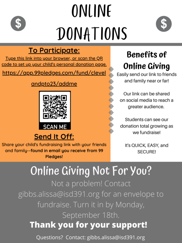 Fundraising efforts are up and running for our annual Walk-A-Thon! Our event will take place on Thursday, September 21st. This has been such a fun event for our elementary students and is our ONE and ONLY fundraiser each year. You can learn a little more about this event by viewing our video on the Cleveland Elementary PTO Facebook page.