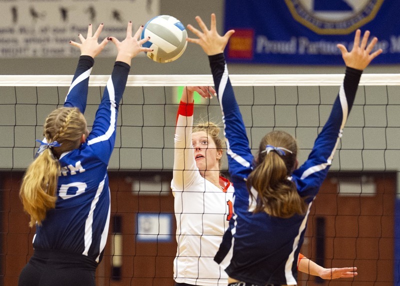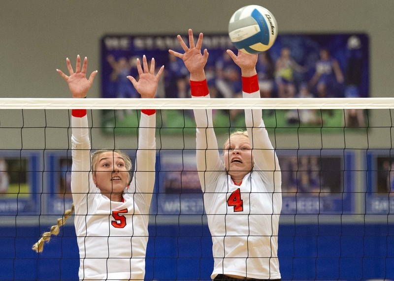 Taylin Gosh and Grayce Kortuem leap for a block.