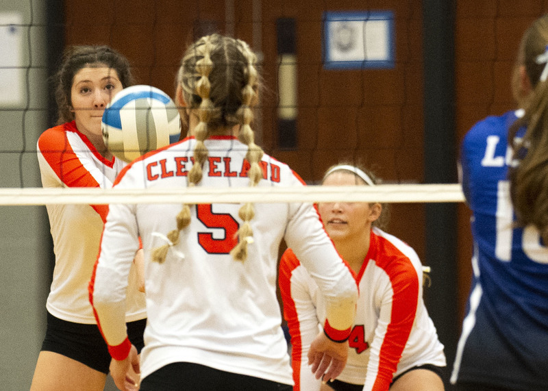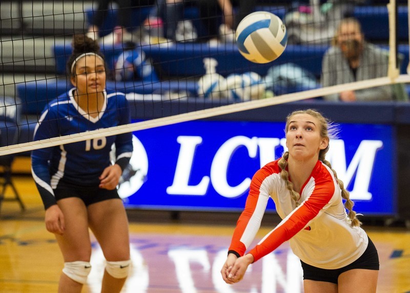 With LCWM’s Lakisha Carter waiting across the net, Taylin Gosh tosses a pass.