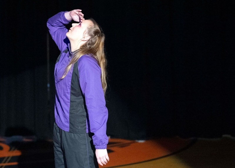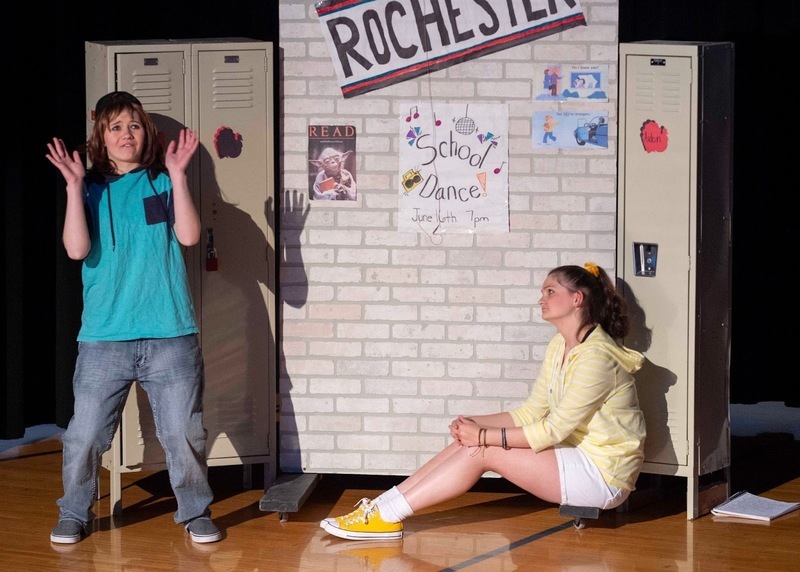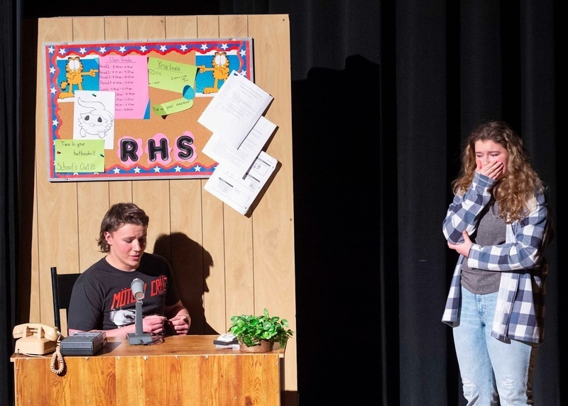 In “End-of-the-day announcement,” Avery (Tanyon Hoheisel) takes over the mic and announces how a misunderstanding ended a relationship with his former girlfriend Bethany (Amelia Tauer, right). Assisted by Micah Peterson, Tauer was also the play's student director. Lights and crew were Logan Porter and Jack Voit.