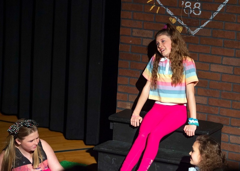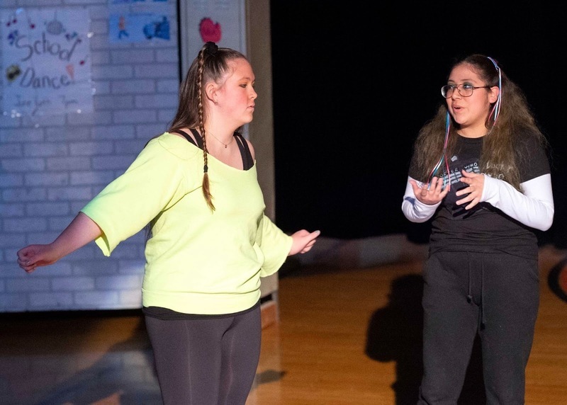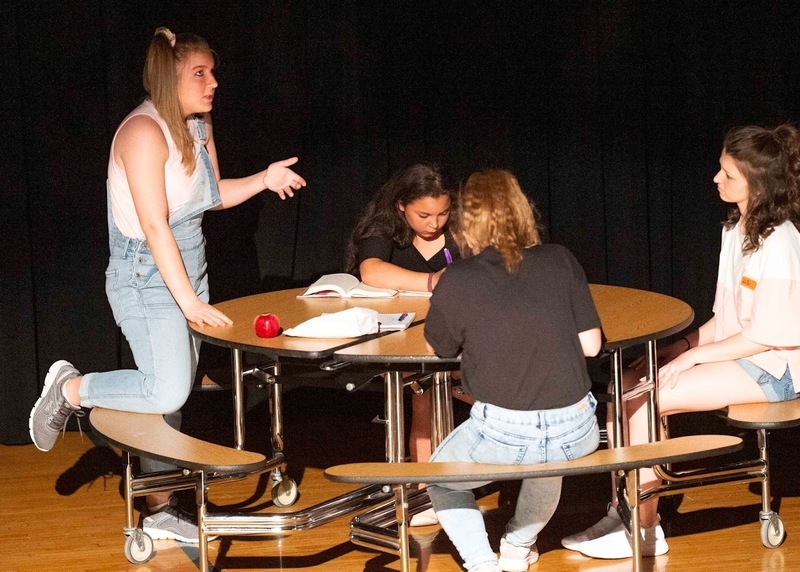 In “I am not invisible/I am not a bad person,” Katie (Micah Peterson, left) and Mary (Mady Seely, right) work out their differences. Also in the scene are extras Ella Lamont and Mylie Dylla.