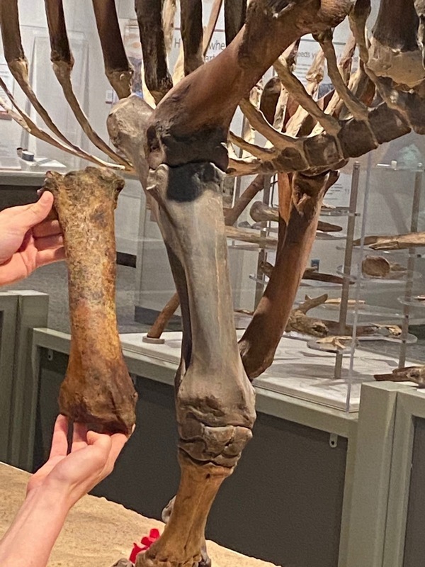 The paleontologists matched the bones to a fossilized skeleton of Bison occidentalis the museum has on display. The larger bone is either a tibia or an ulna, and the smaller bone is a metacarpal.