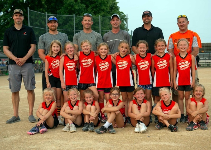 First and second grade softball: L-R, front row: Lucy Smith, Khloe McCabe, Lexi Wobbrock, Bella Baker, Eva Schummer, Addy Hoffman and Kendall Kern. Second row: Ruby Page, Blair Voit, Emmy Miller, Olivia Olson, Kenzie Sandhurst, Kennedy Dauk, Ava Jobe and Jayda Roemhildt. Back row coaches Nick Page, Dustin Hoffmann, Nick Smith, Brady Olson, Steve Baker and Jason Voit.