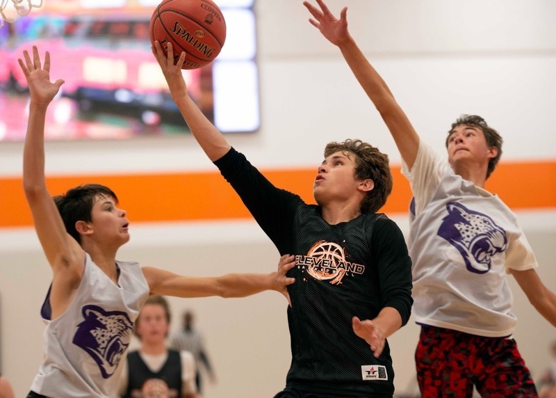 Sandwiched by a couple of GHEC/T defenders, Braeden Hastings drives to the iron.