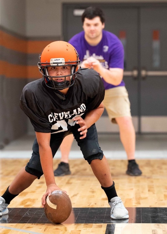 Adam Kunkel helps a younger player practice long snaps.