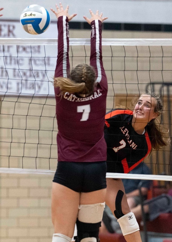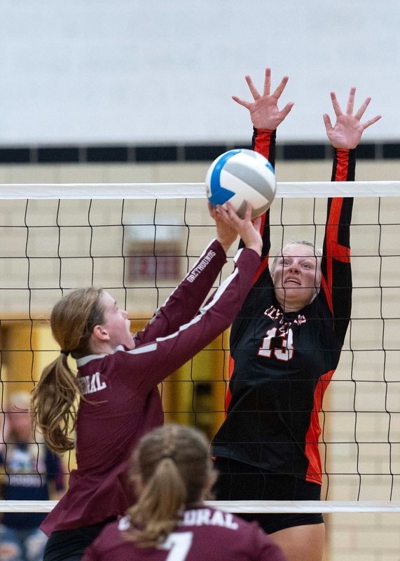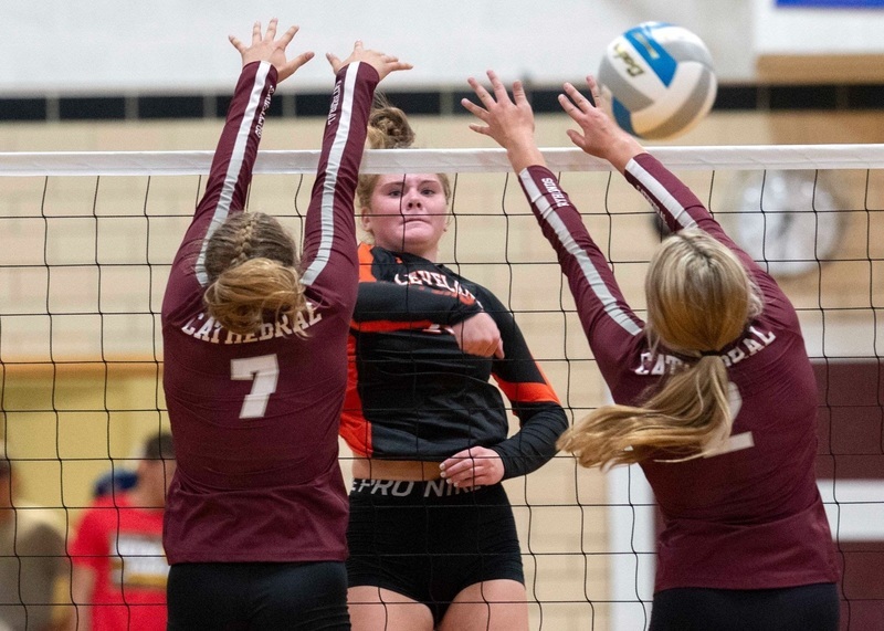 Emily Kern spikes between two New Ulm Cathedral defenders.