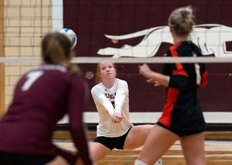 Above: Jordyn Klingel makes a two-handed bump. With usual setter Taylin Gosch out for a few games, Klingel took over the setting role.