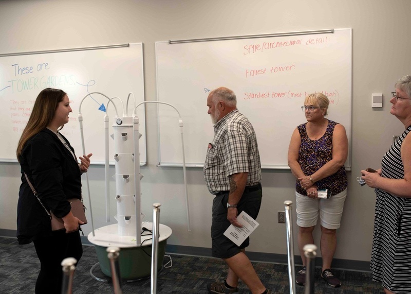 Student tour guide Ashley Connor (left) shows her tour the hydroponic tower gardens in the agriculture and STEM lab. The towers are used to grow plants, like vegetables, in water instead of soil.