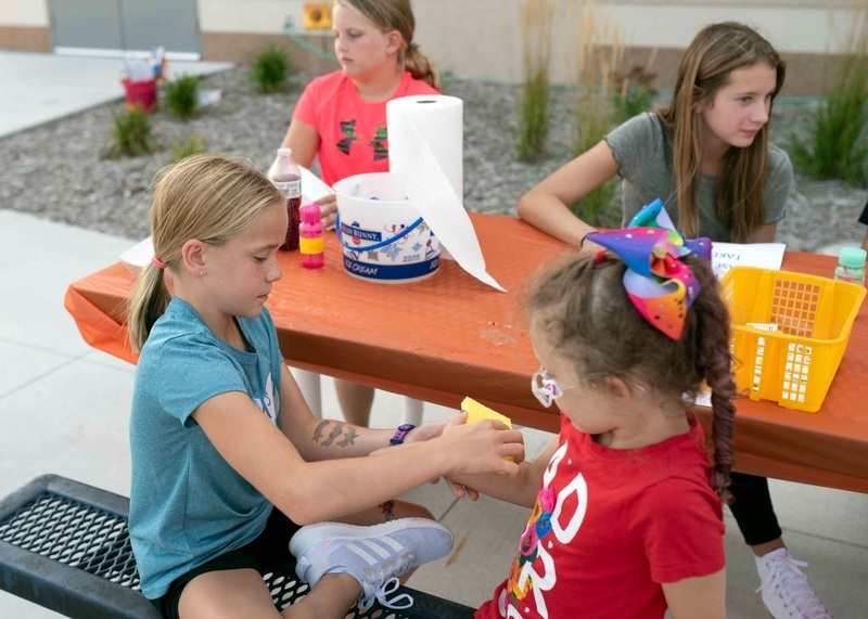 Kylie Wobbrock applies a “tattoo” to kindergartner Madison Green.