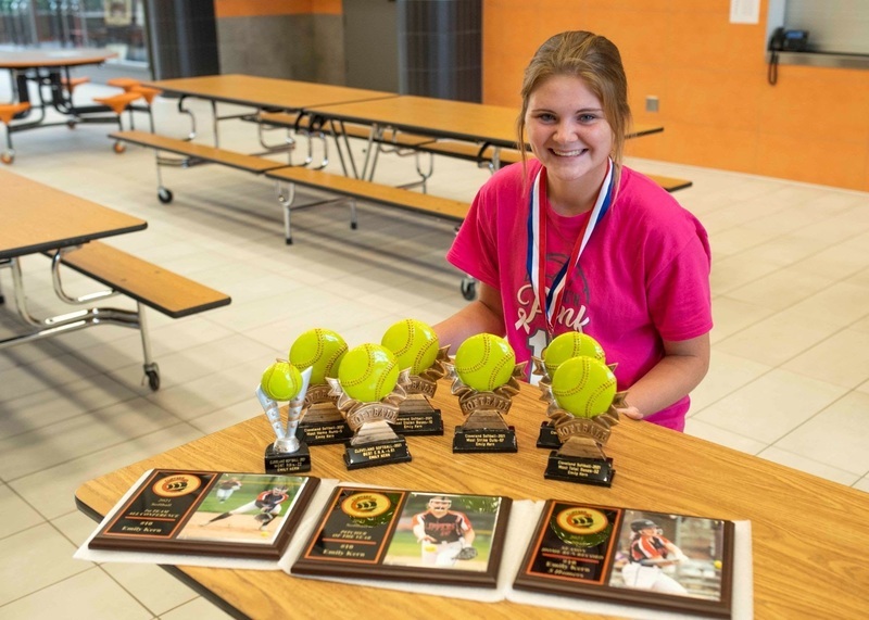 Emily Kern will need her dad Rich to build her another shelf just for the hardware she took home from the softball banquet.