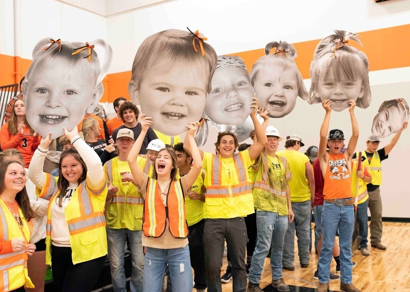 Complete with shovels, hard hats and neon vests, the student section was geared up to do some road construction. Here, Ashley Connor, Lacey McCabe, Jackson Meyer, Cade Kriha, Riley Knish and Fisher Knish hold up likenesses of some of the senior players.