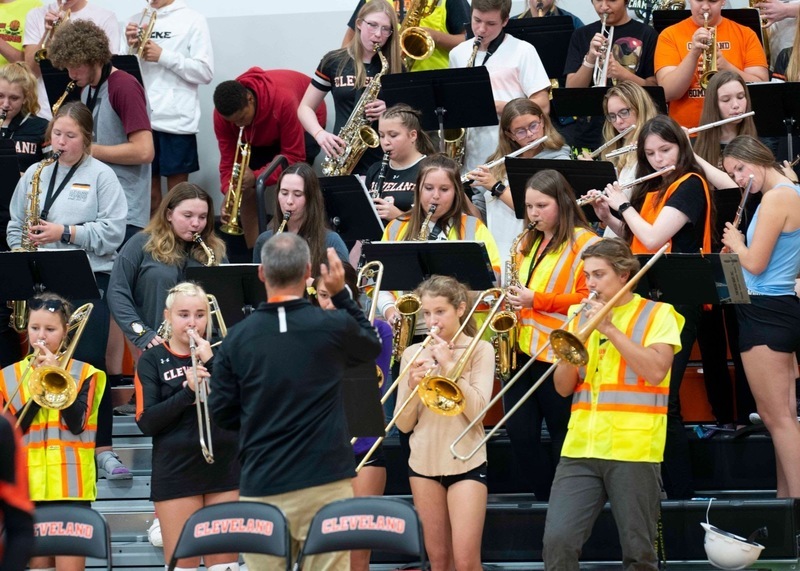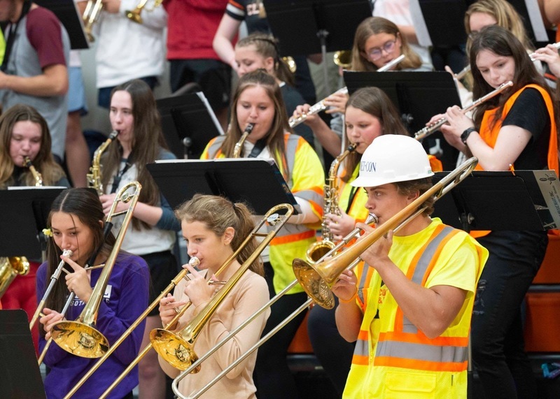 It was the first gig for the pep band in the new gym. Rocking the hard hat is Jackson Meyer.