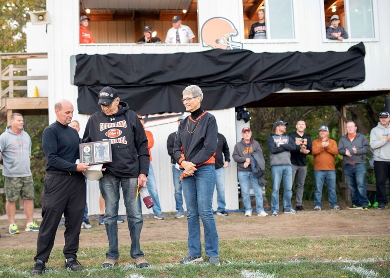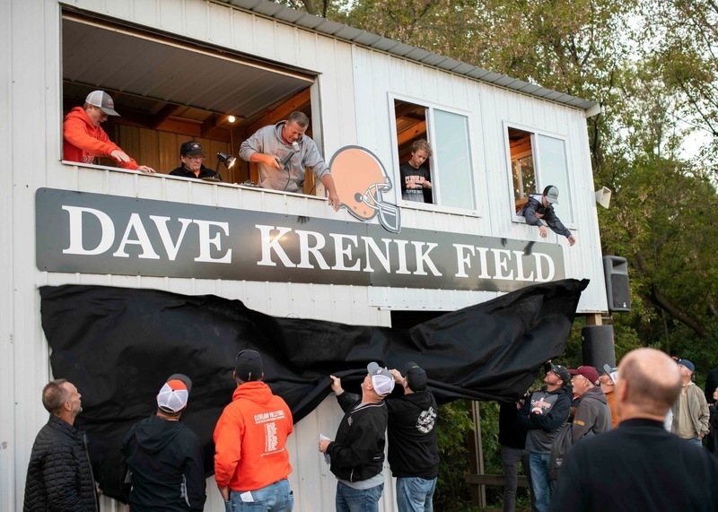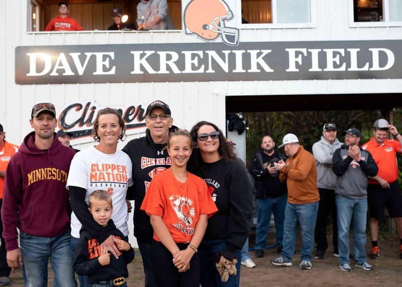 So, in ceremonies before Cleveland’s game against Lester Prairie on Friday, and with many of Krenik’s friends, former players and family looking on, the field was officially designated Dave Krenik Field. He received a commemorative plaque and watched as his name—on a 20-foot-long sign across the crow’s nest—was unveiled.