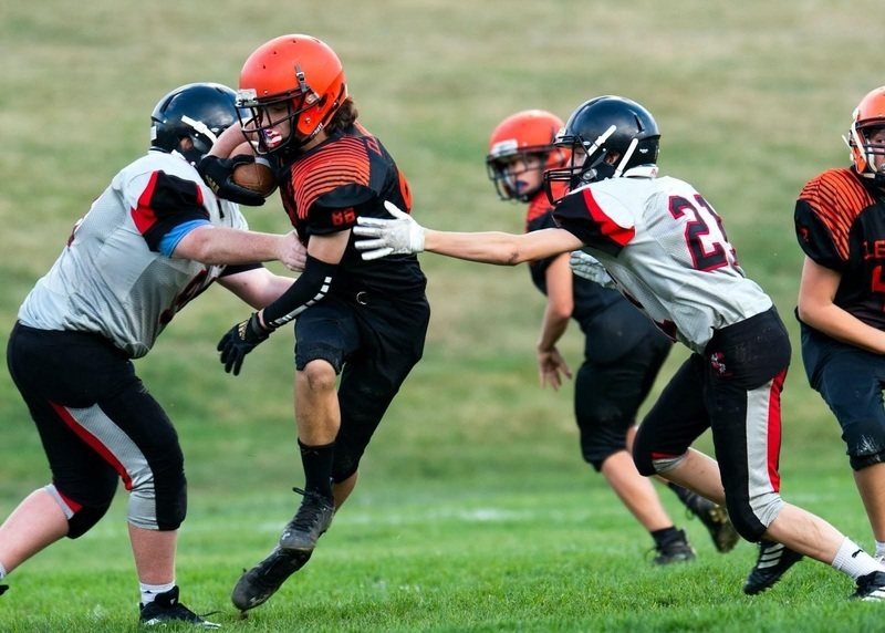 Eighth grader Mason Kluntz and seventh grader Braeden Smith wrap up a Knight runner while eighth grader David Draheim readies to move in.