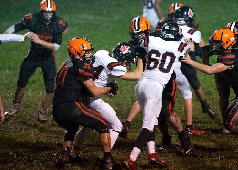 Lucas Walechka wrestles down a Crusader runner during a rainy third quarter.