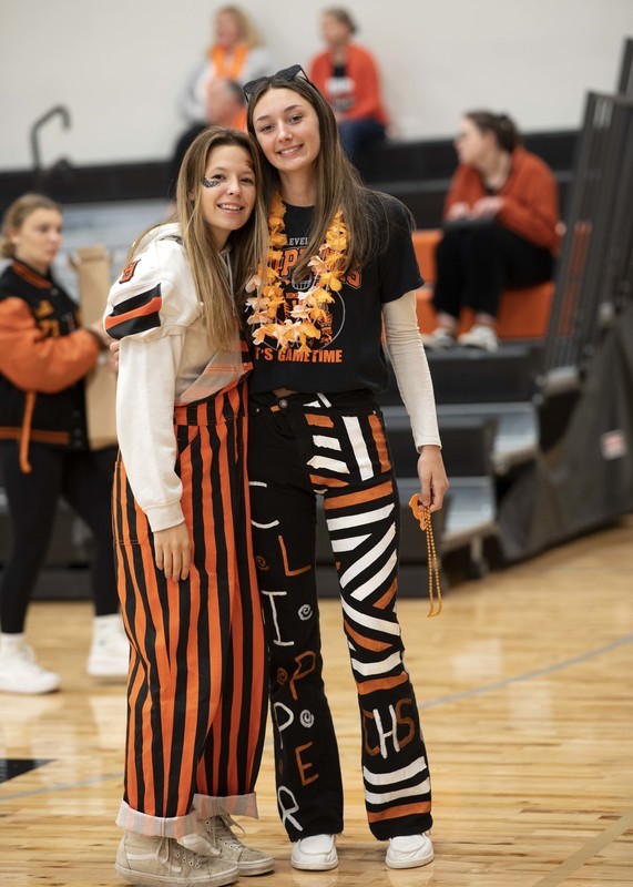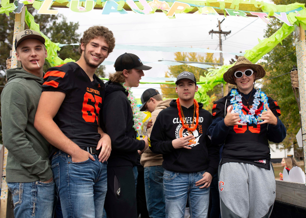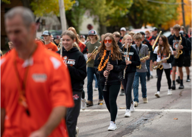 Before the parade, students rallied at a pep fest in the new gym. AD Rich Kern brought up all the high school sports teams for introductions. Royalty played a guess-their counterpart’s answer game, and the pep band added to the festive atmosphere.