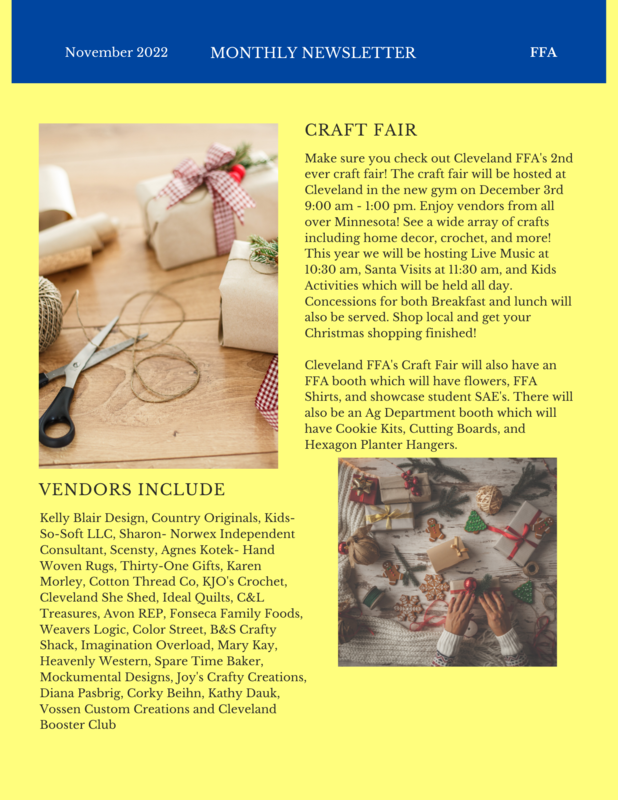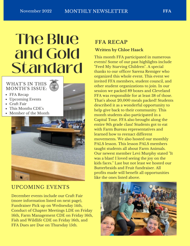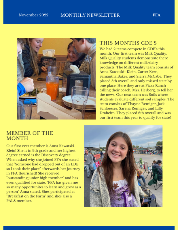 In this episode, follow along with hosts Evelyn Keltgen and Chloe Haack as they discuss the history and some important symbols and traditions of FFA, including their own experience. Hear a featured interview from November's member of the month, Anna Kawatski- Klein. Below, check out the newsletter to see what we have been up to this month!